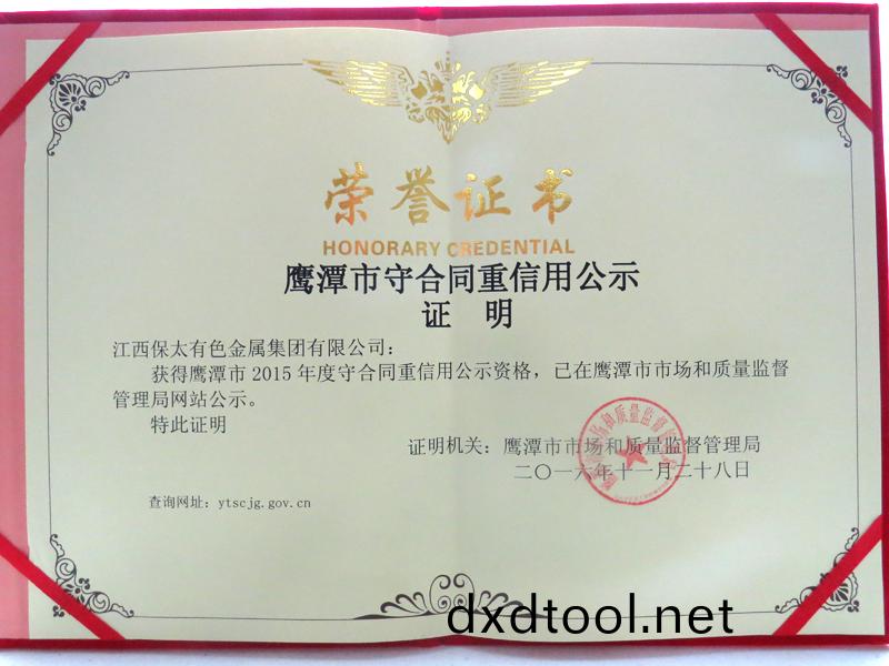 Recently, our company has won the qualification of "YingtanCity Contract seriously Credit Enterprise in 2015'' again. For enterprises thatdeclare "abide by the contract and attach importance to credit", theAdministration for Industry and Commerce will comprehensively evaluate itsbasic information, enterprise brand management level, enterprise contractcredit management level, corporate contract performance ability and situation,corporate operating efficiency, corporate social responsibility and credit,corporate social honor, and so on, then the outstanding enterprises that havebeen strictly screened through layer by layer can win this honor. Our companyhas won this honor for many years in succession.