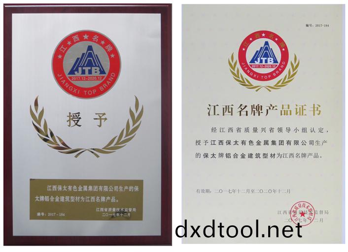 On December 19, 2017, the announcement of Jiangxi Provincial leading Group on the Identification of Jiangxi famous Brand products 2017 announced that 253 products were "Jiangxi famous brand products 2017". Among them, the Baotai aluminum alloy building profiles produced by Jiangxi Baotai Group were awarded the title, and the certificate No. is: 2017 / 184.