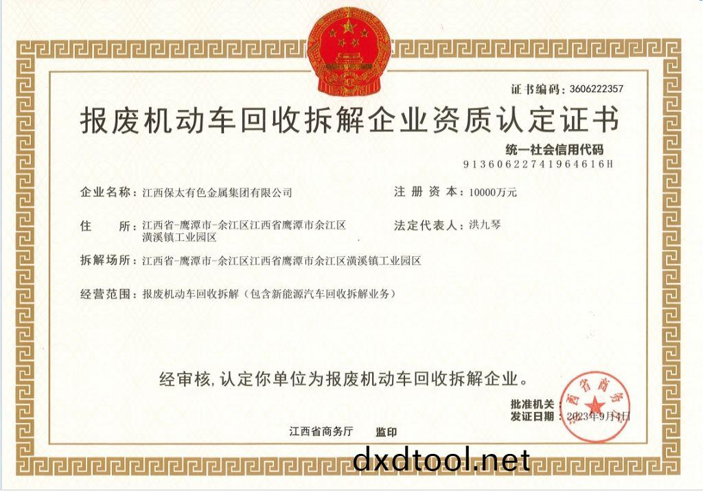 Jiangxi baotai Non-ferrous Metal Group Co. , Ltd. has passed the acceptance test organized by the Jiangxi Provincial Department of Commerce and successfully obtained the qualification certificate of the scrap vehicle recycling and dismantling enterprise. Today has been officially launched on-line business, can start to buy a large number of scrap cars.